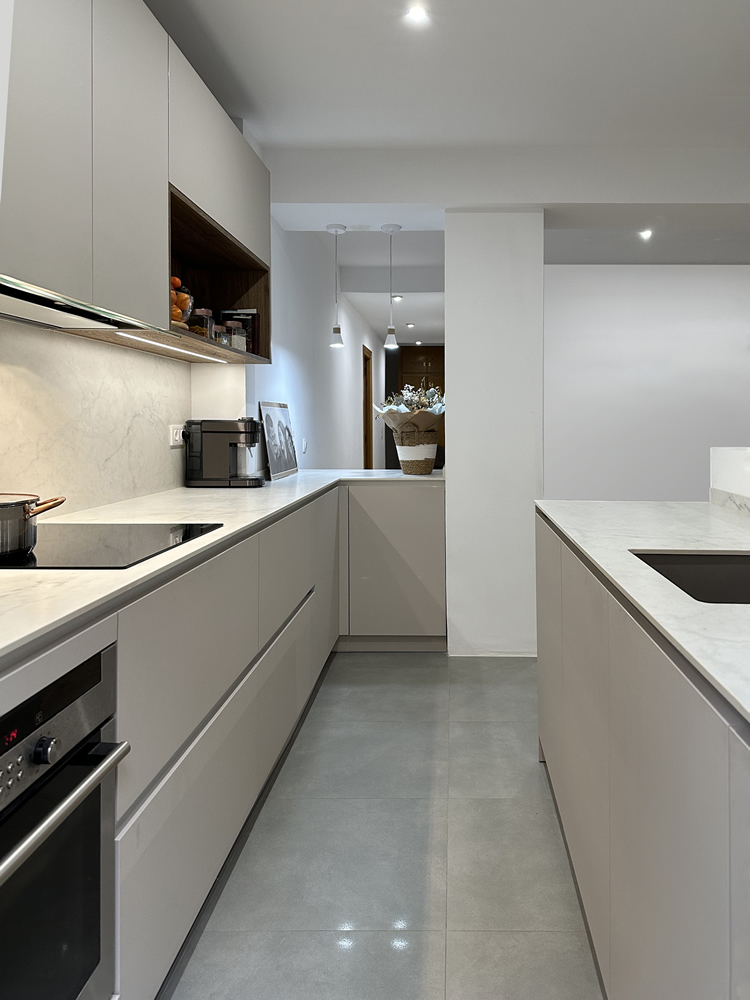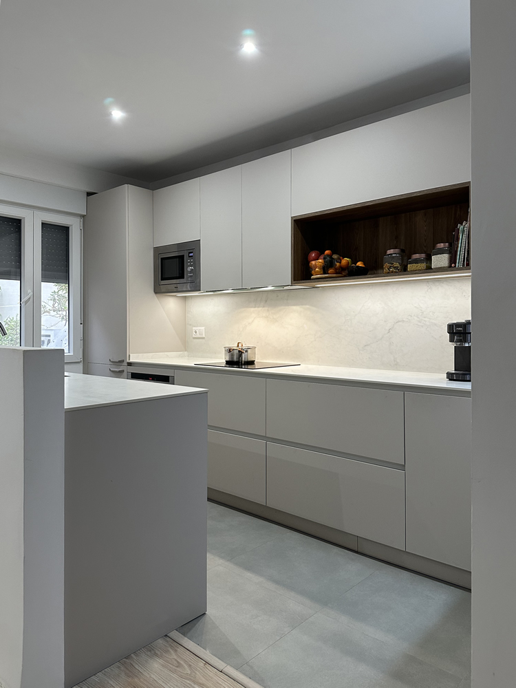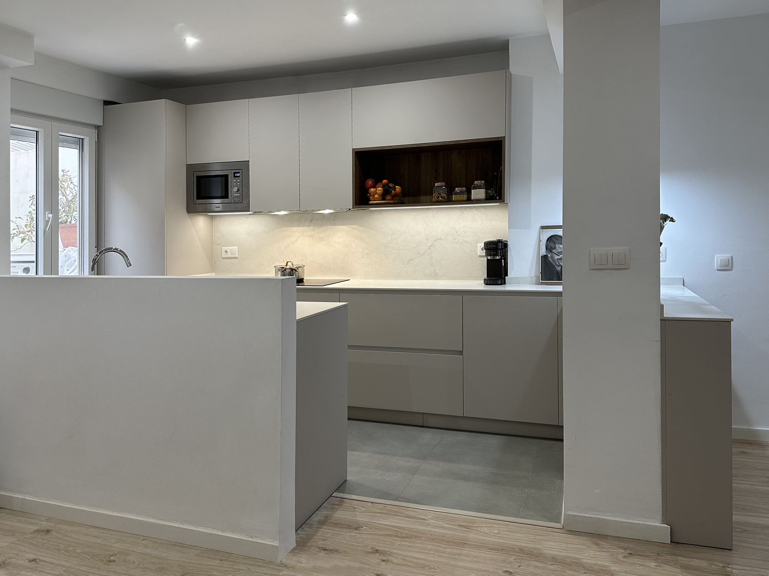Cocina con puertas en laminado color visón y textura extramate antihuellas. Decorativo en roble medio. Aperura gola. En esta integración de la cocina con el salón se ha mantenido el tabique de separación hasta una altura de 120cm para poder pasar las instalaciones de desagüe y tomas de agua por un lado y para la televisión por el otro.