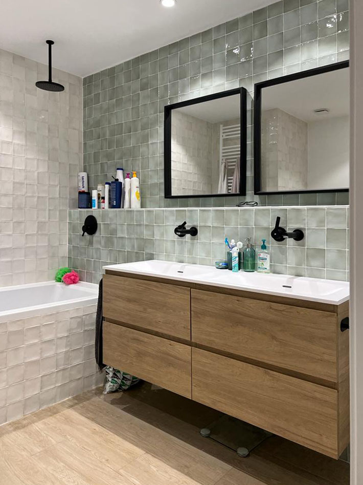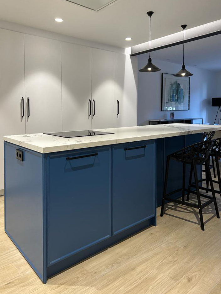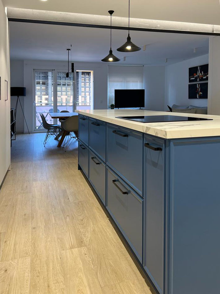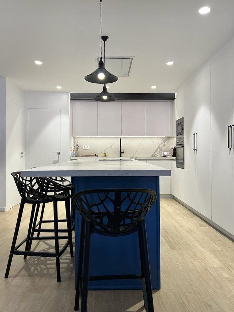 En este proyecto se realizó un derribo total de la vivienda, así se adapto a todas las necesidades que requerían los clientes. Uno de los elementos que más destaca esta reforma son las vigas vistas, las cuales dotan al espacio de gran personalidad. Además de la gran isla en laca azul, que integra la cocina con el salón-comedor.