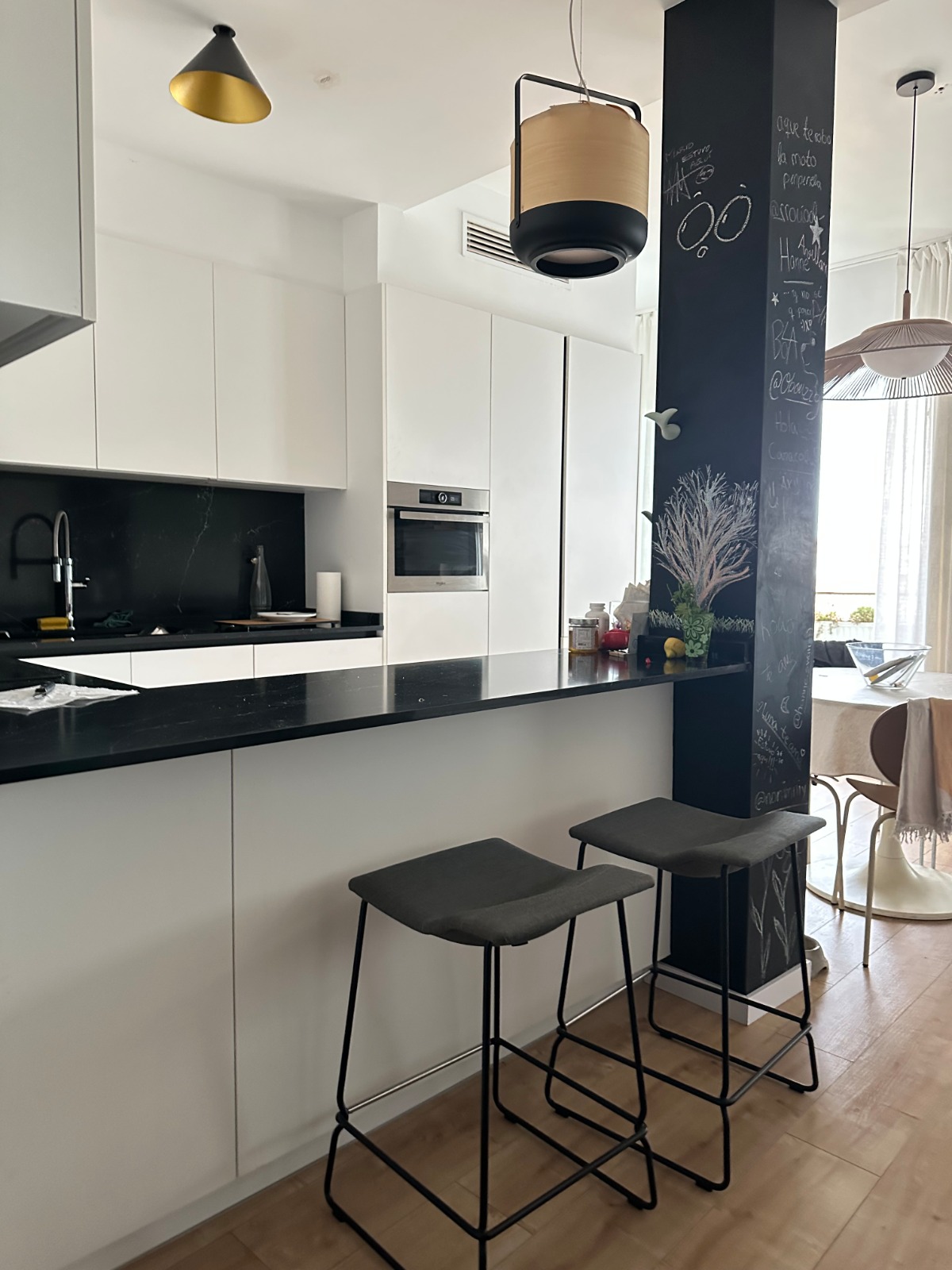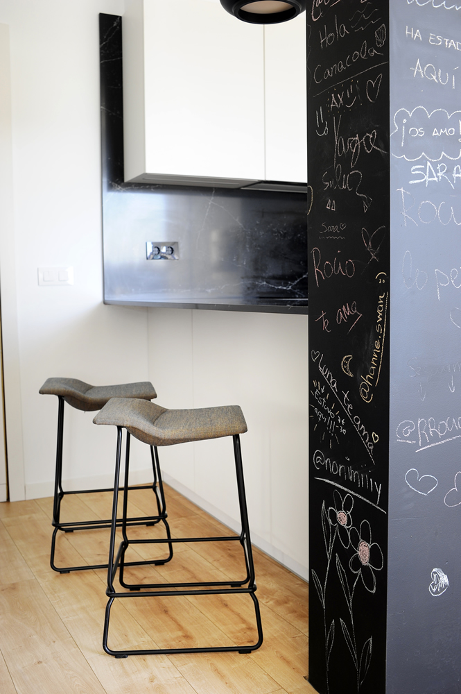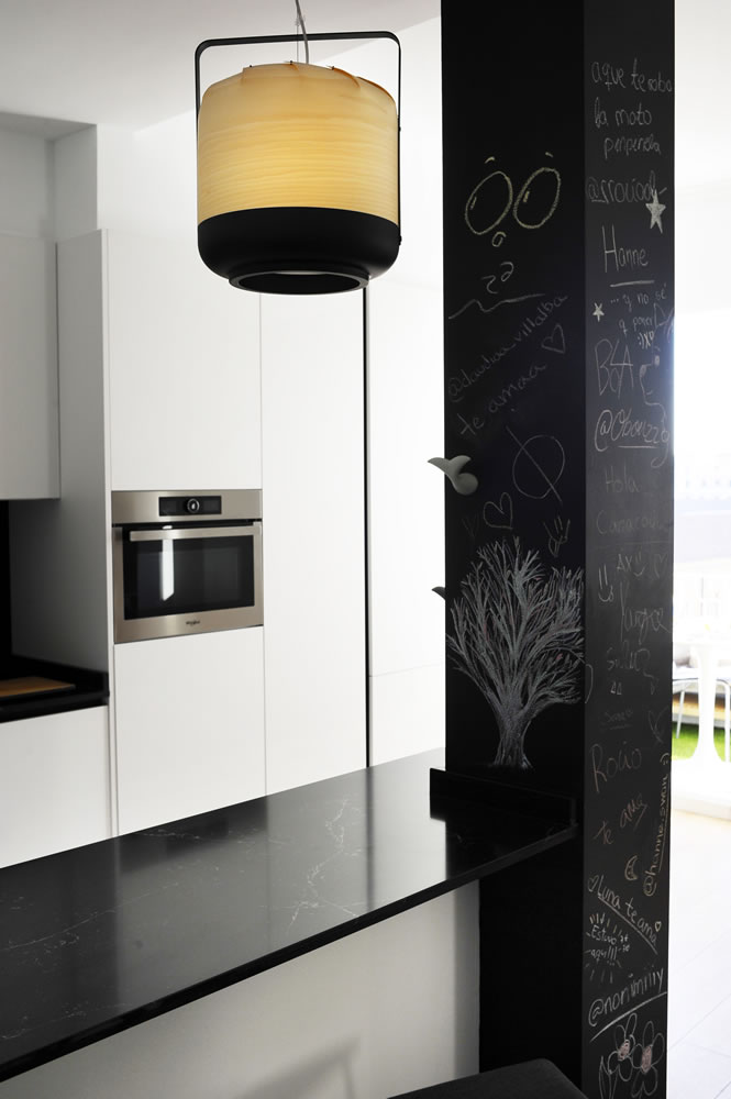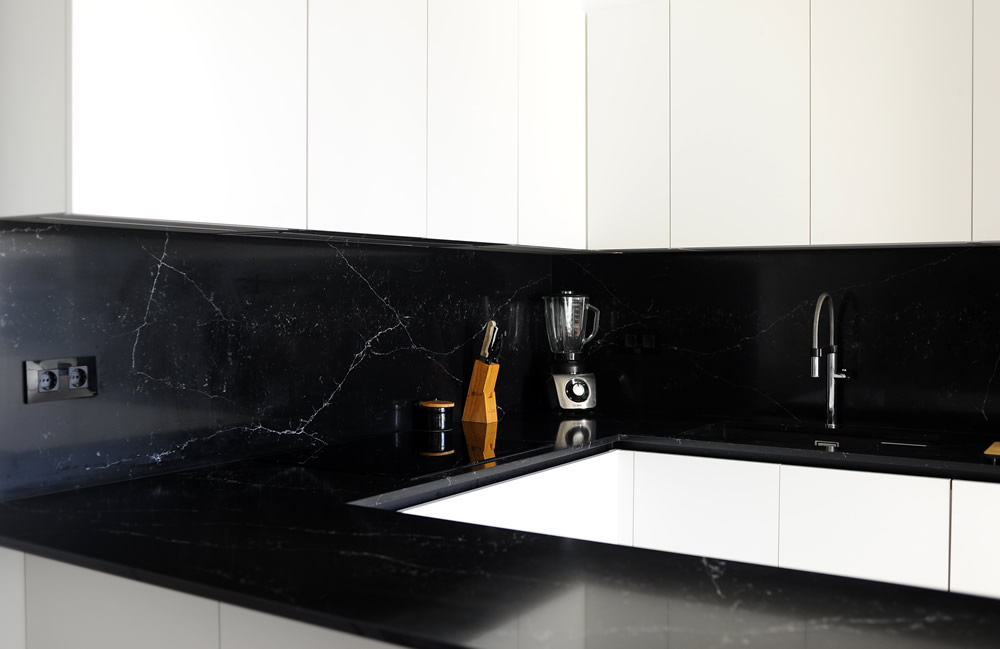 Cocina en laminado blanco super BLM-13, con tirador Gola en negro y bancada Compac Unique Marquina, reforzando el contraste blanco/negro.